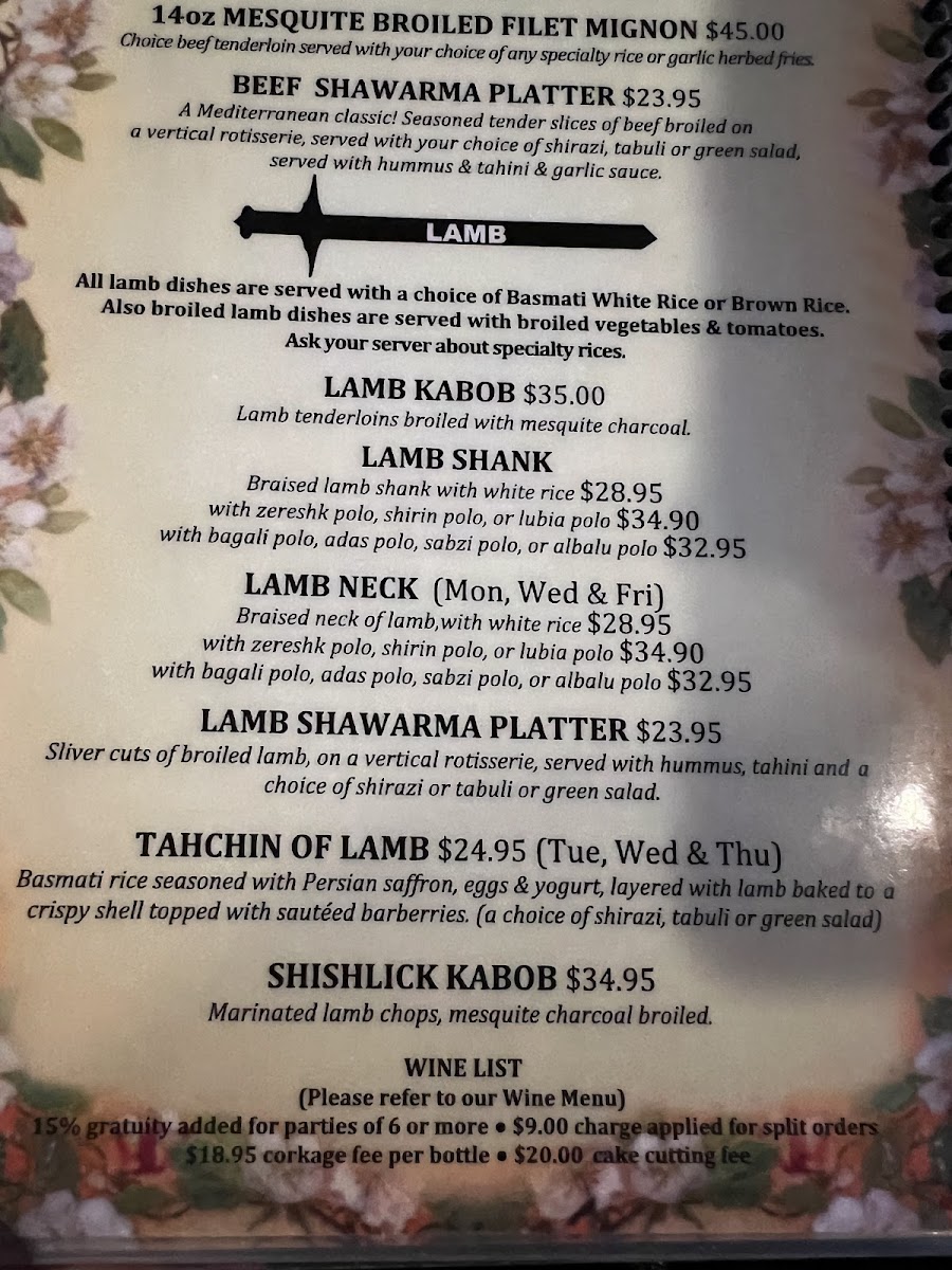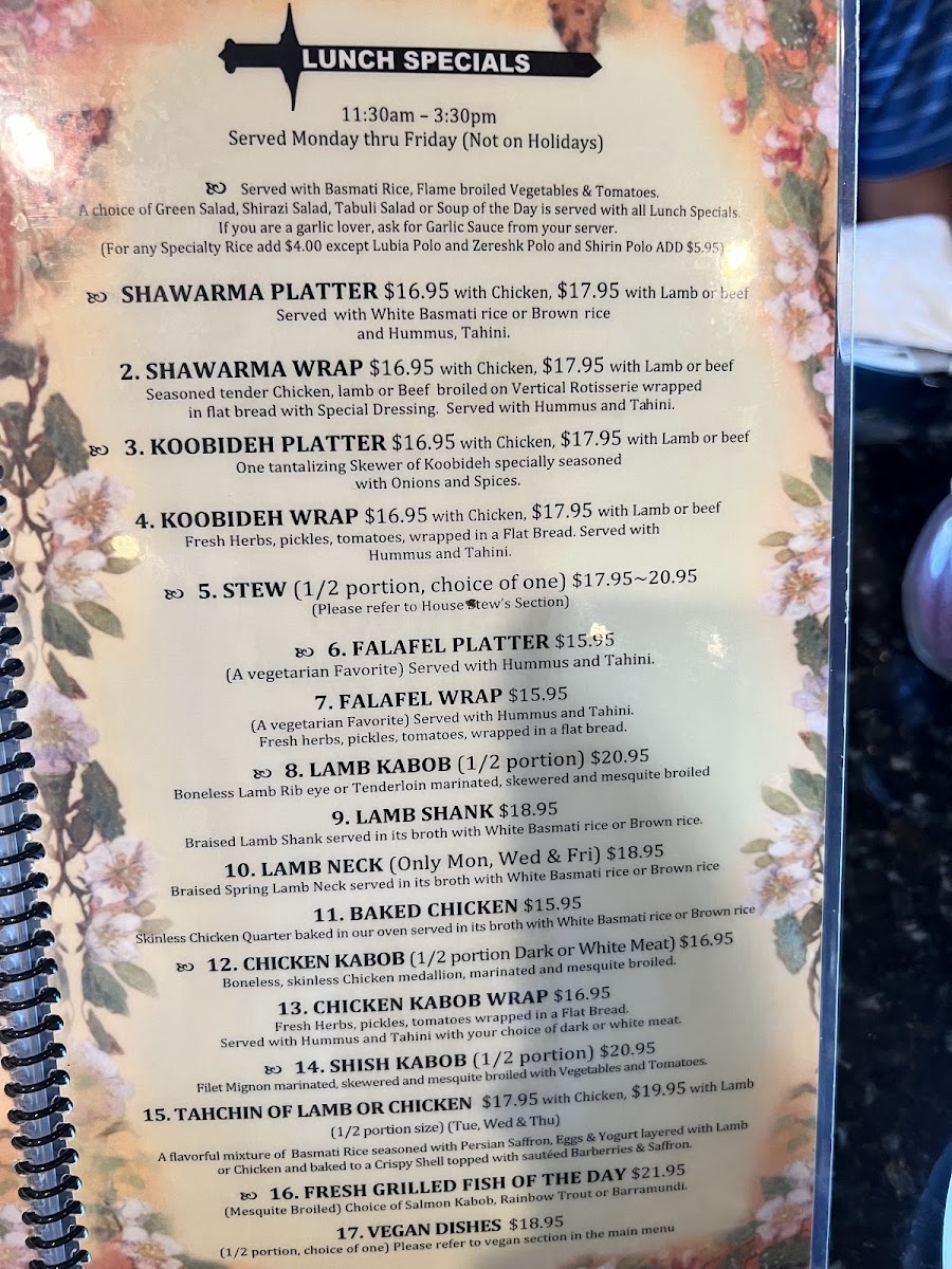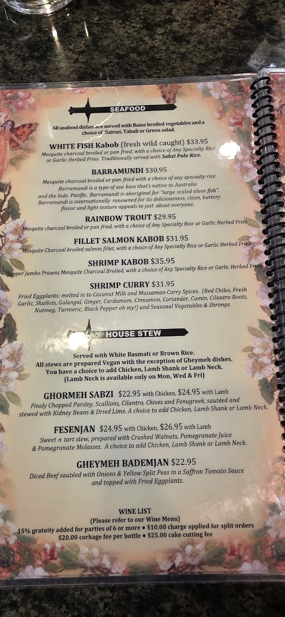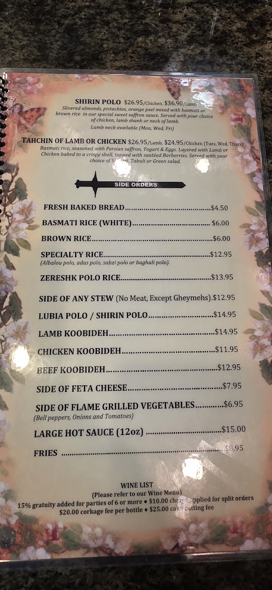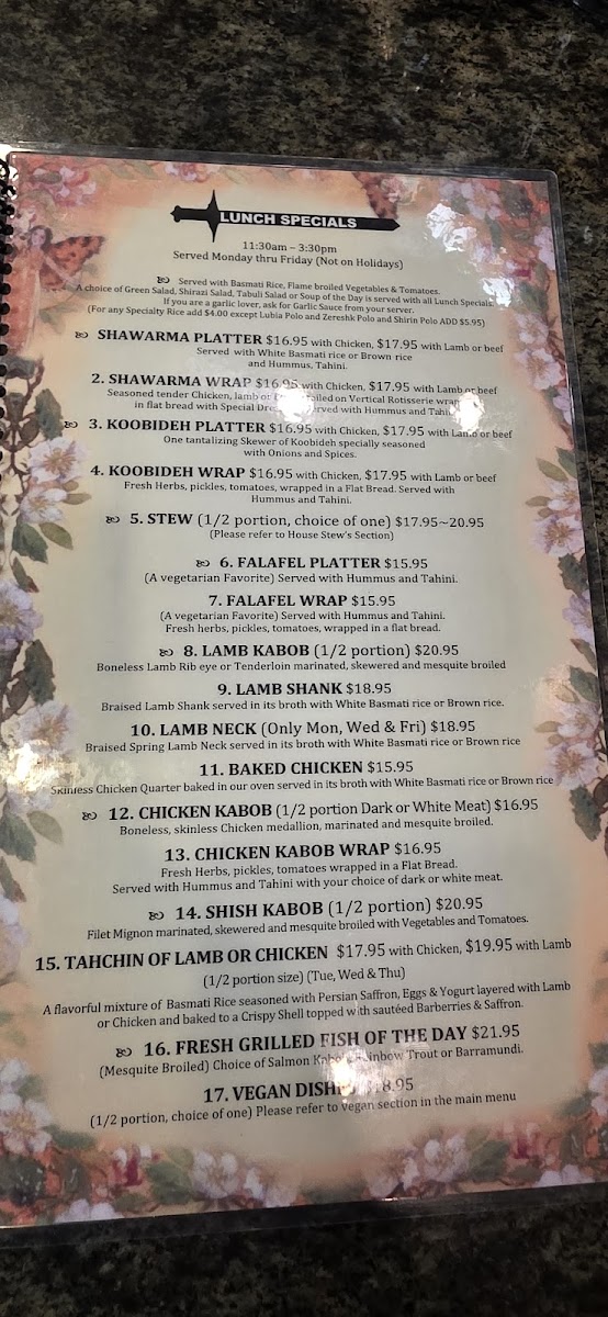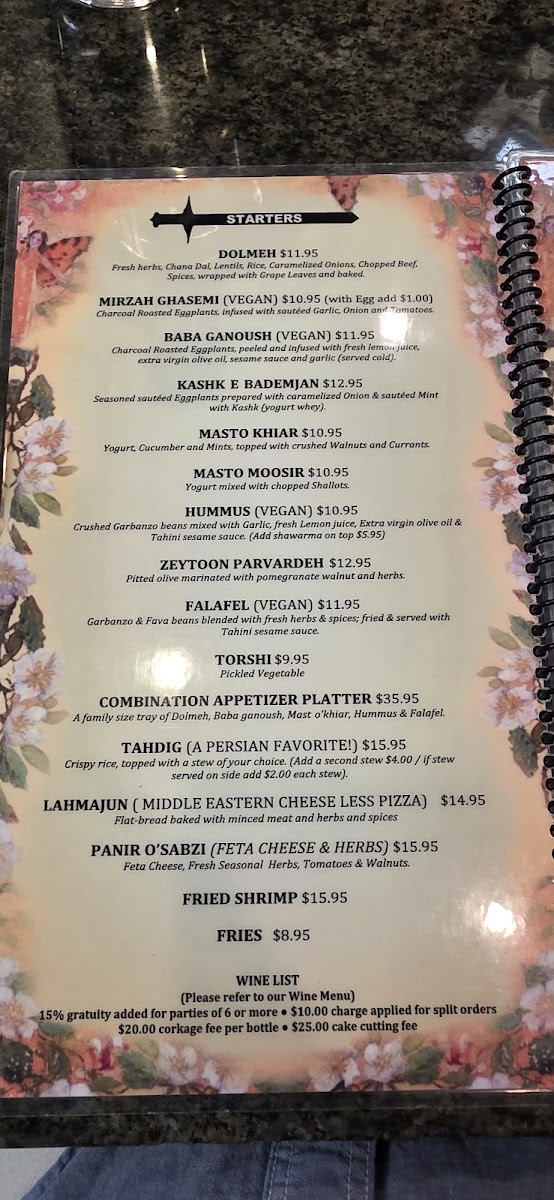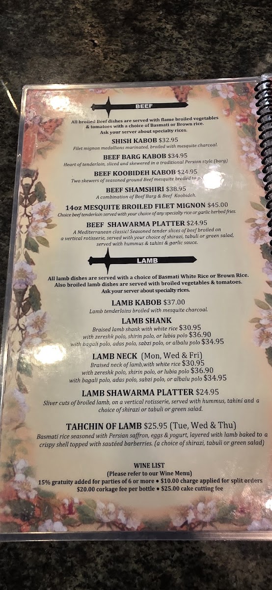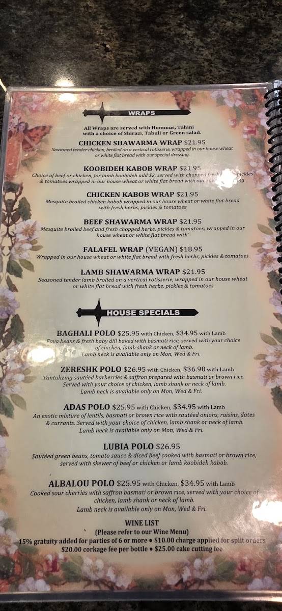 The menu features a tantalizing array of traditional Persian dishes, and each item is prepared with an emphasis on quality and authentic flavors. Standout highlights include the succulent lamb kebab, tender lamb shank, and flavorful grilled meats, each artfully accompanied by fluffy basmati saffron rice, seasonal grilled vegetables, and smooth hummus. For those seeking something uniquely Persian, the Shirin polo and Koobideh platter are must-tries, celebrated for their satisfying taste and generous portions that often leave guests with delicious leftovers.